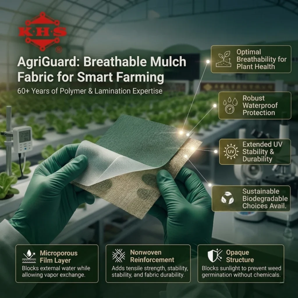 AgriGuard by Kae Hwa Industrial provides breathable waterproof mulch fabric made from film-nonwoven laminates — conserving water, blocking weeds, and promoting sustainable farming.