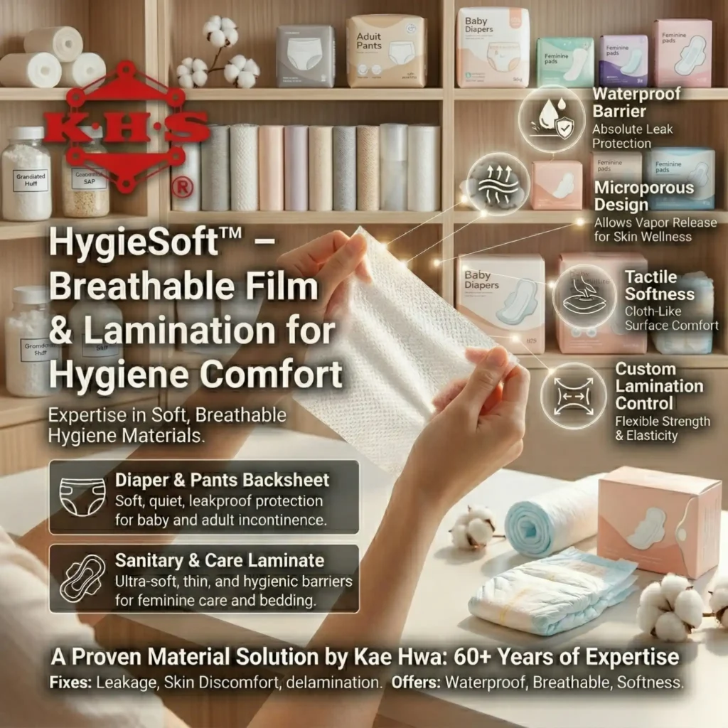 With over 60 years of polymer innovation, Kae Hwa is a proven specialist in breathable films for the global hygiene industry. Our materials are manufactured under strict ISO 9001 and ISO 14001 certified systems, ensuring reliable, safe, and consistent quality for intimate care products.