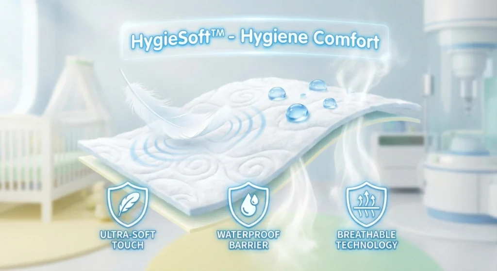 To meet premium wellness standards, the backsheet must act as a dynamic membrane. HygieSoft™ achieves this by allowing microscopic water vapor to escape while locking in macroscopic fluids, setting the benchmark for freshness, hygiene, and all-day comfort.