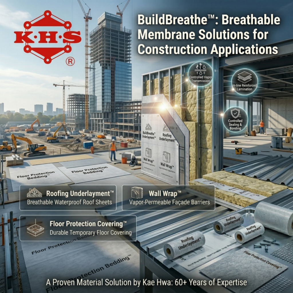 BuildBreathe™ by Kae Hwa Industrial offers a new generation of breathable waterproof membranes specifically engineered for roofing underlayment and building envelopes. These technical laminates utilize advanced microporous or monolithic film technology to block external rain and wind while allowing trapped moisture vapor to escape. By effectively reducing condensation and preventing mold growth, BuildBreathe™ ensures long-term structural integrity and energy efficiency for modern architecture.
